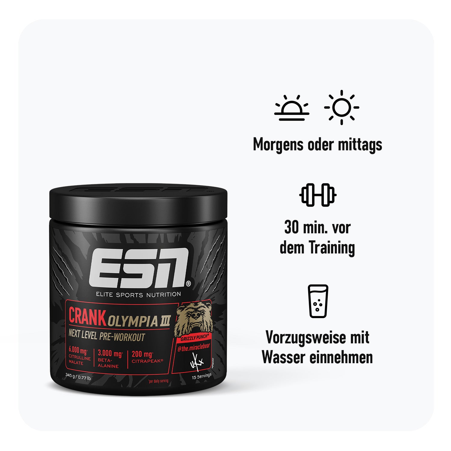 Next level boost and get in the zone – Crank Olympia 3.0 ist die nächste Evolutionsstufe unseres beliebten Olympia Boosters, mitentwickelt von unserem Pro-Athleten Urs Kalecinski. Das neuste Upgrade unserer erfolgreichen Formel beinhaltet neben erhöhtem Synephringehalt und Niacin den exklusiven und patentierten Pump-Wirkstoff CitraPeak® für eine Voluminisierung auf einem neuen Level und ein noch intensiveres Trainingserlebnis. Das Ergebnis: Der optimale Boost für Energie, Drive und Pump.1,2,3,4,5,6