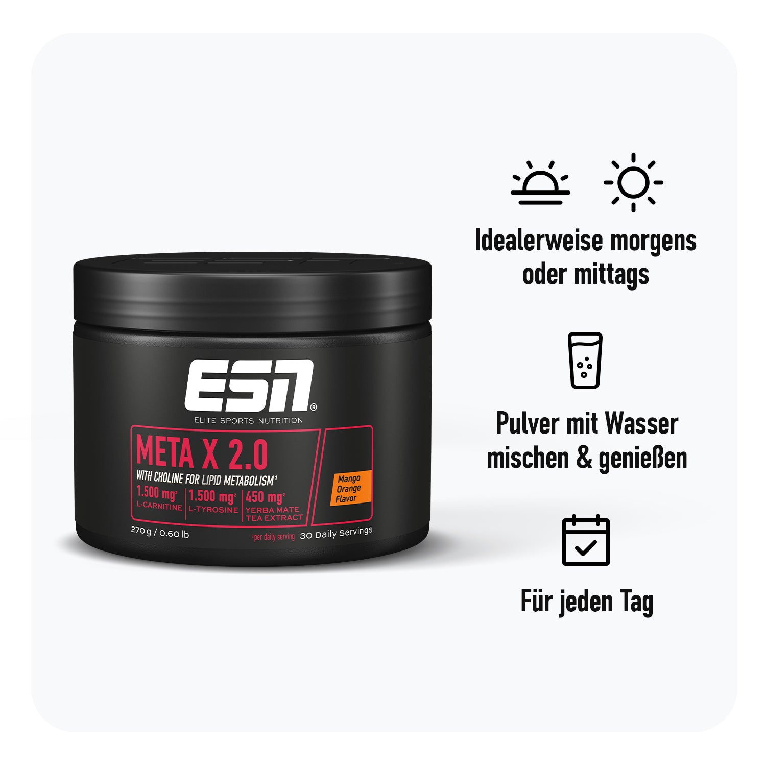 L-Carnitin-L-Tartrat, Säuerungsmittel (Citronensäure), L-Tyrosin, Säureregulatoren (Natriumhydrogencarbonat), Yerba Mate Tee-Extrakt, Aroma, Bitterorangenschalen-Extrakt, L-Glycin, Grünteepulver-Extrakt, Cholinbitartrat, Pomelo-Extrakt, Süßungsmittel (Sucralose, Acesulfam K), Farbstoffe (Carotin), Sophora Japonica-Extrakt, Bitterorangen-Extrakt, Extrakt aus Panax notoginseng und Astragalus membranaceus (AstraGin®), Schwarzer Pfeffer-Extrakt, Niacin (Nicotinamid), Selenmethionin.Key Facts – Meta X 2.0
