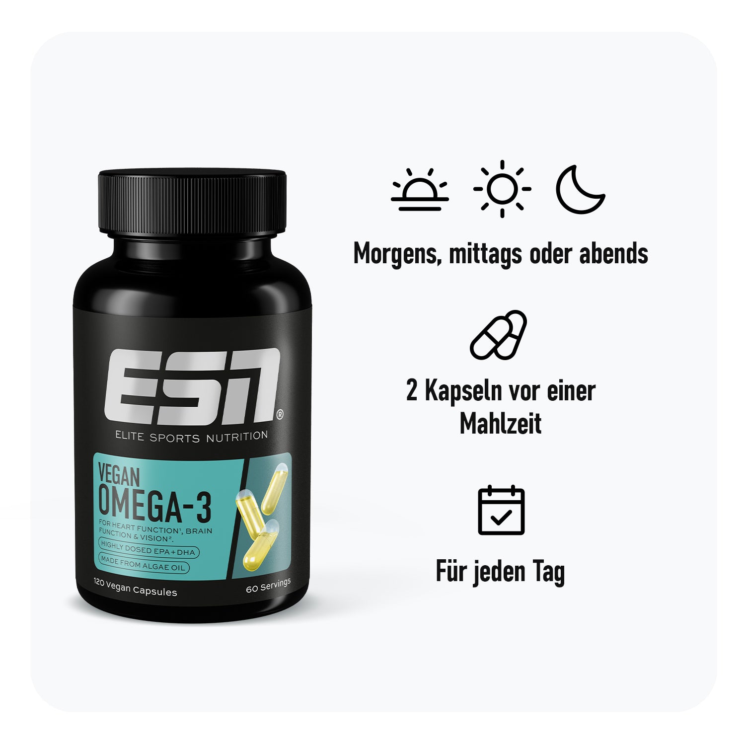 Omega-3 goes vegan. Mit Vegan Omega-3 versorgst du deinen Körper gezielt mit den essentiellen Fettsäuren EPA und DHA – rein pflanzlich aus Meeresalgen. Sie unterstützen dein Herz, das Gehirn und die Sehkraft. 1,2,3