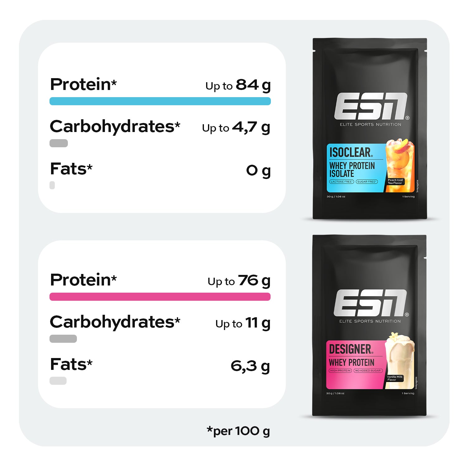 Boost your daily protein intake with our Protein Starter Kit. Discover Isoclear® — a clear, refreshing protein drink that tastes just like lemonade or iced tea — and Designer Whey, our creamiest protein powder for shakes, porridge and more.