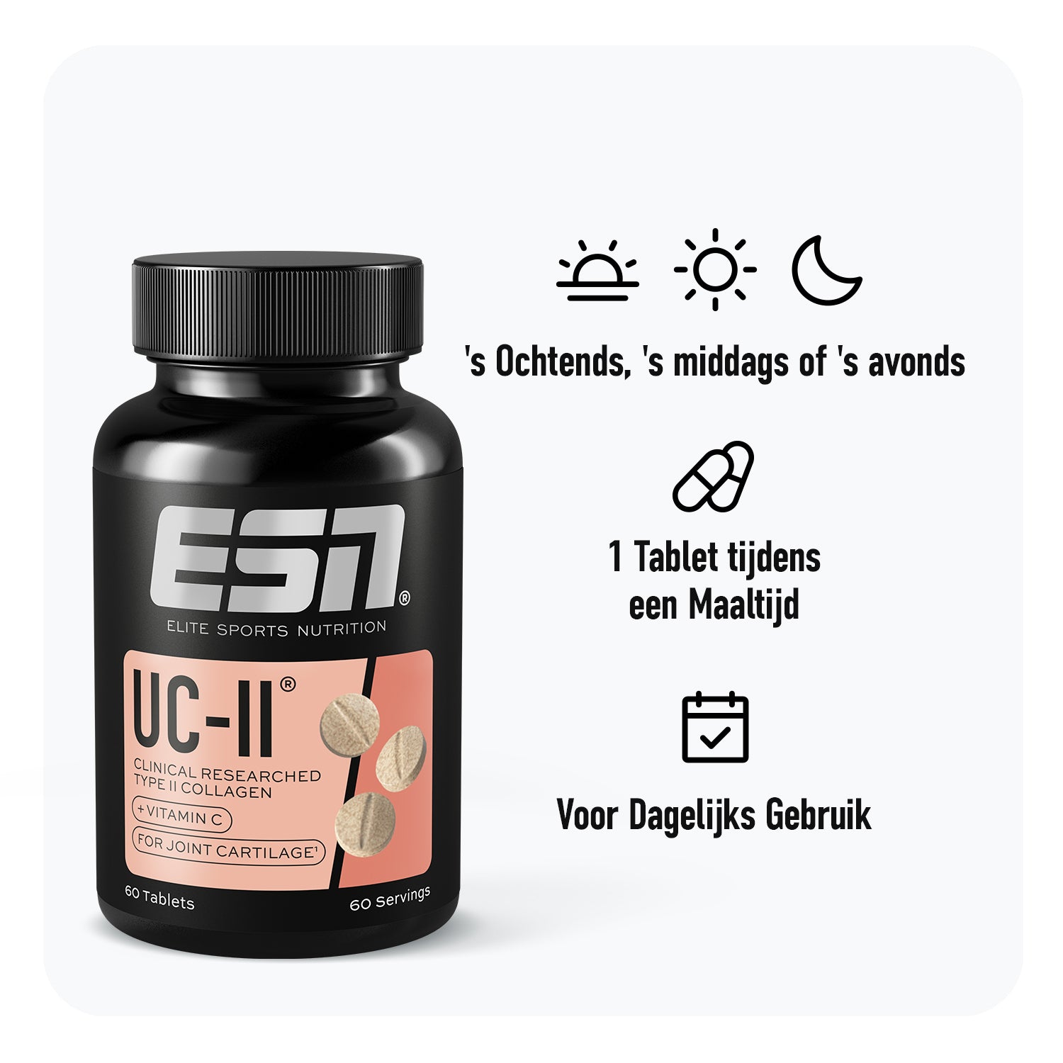 De aangegeven dagelijkse dosis mag niet worden overschreden. Voedingssupplementen zijn geen vervanging voor een evenwichtige en gevarieerde voeding en een gezonde levensstijl. Buiten het bereik van kleine kinderen bewaren. UC-II® is een handelsmerk van Lonza.