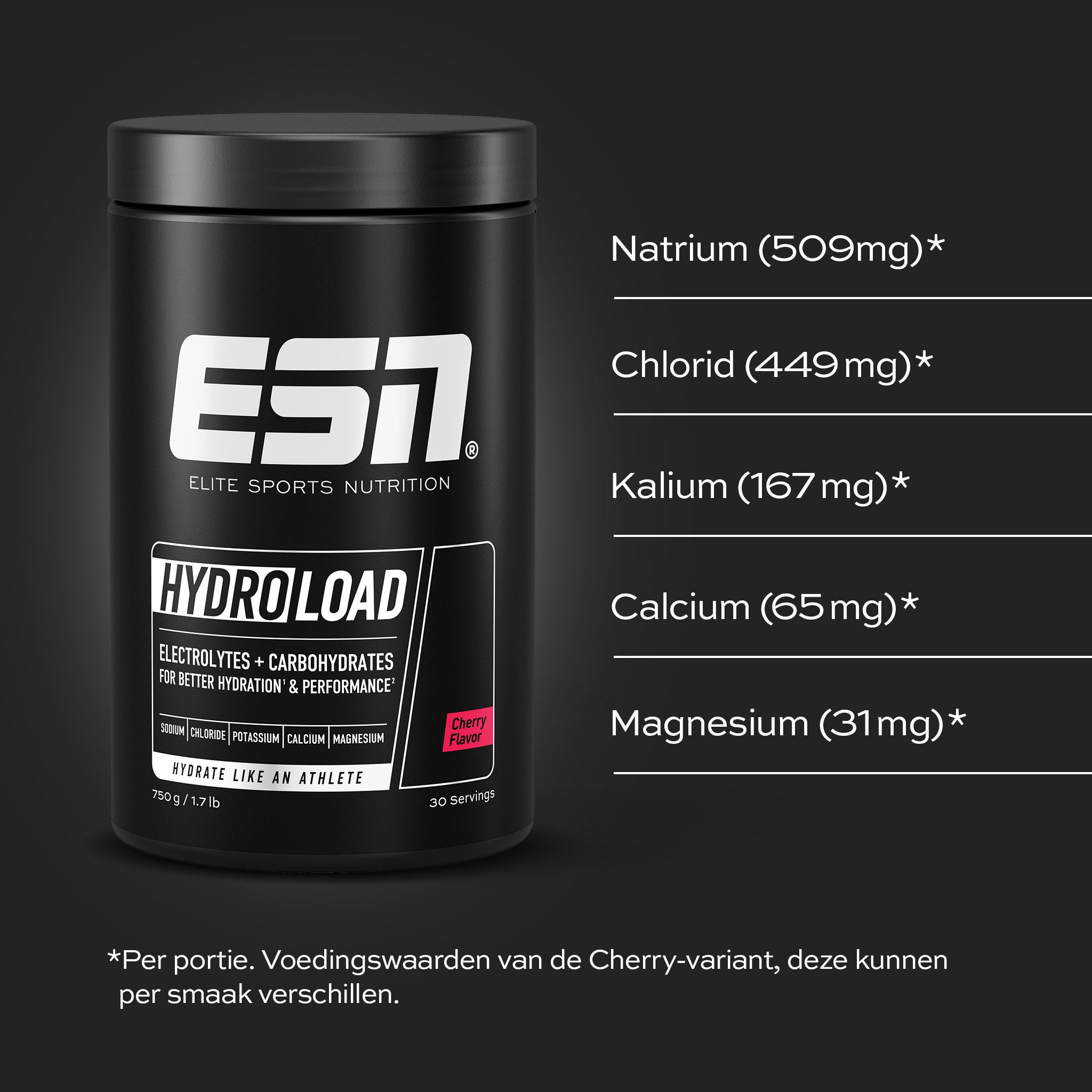 Dextrine, dextrose, voedingszuren (citroenzuur), aroma, natriumbicarbonaat, antiklontermiddelen (siliciumdioxide), natrium chloride, trinatriumcitraat dihydraat, calciumgluconaat, kleurende voedingsmiddelen (bietenpoeder), kaliumchloride, magnesiumcitraat,kaliumcitraat, zoetstoffen (sucralose, acesulfaam-k), kleurstoffen (caroteen).HydroLoad Key-Facts