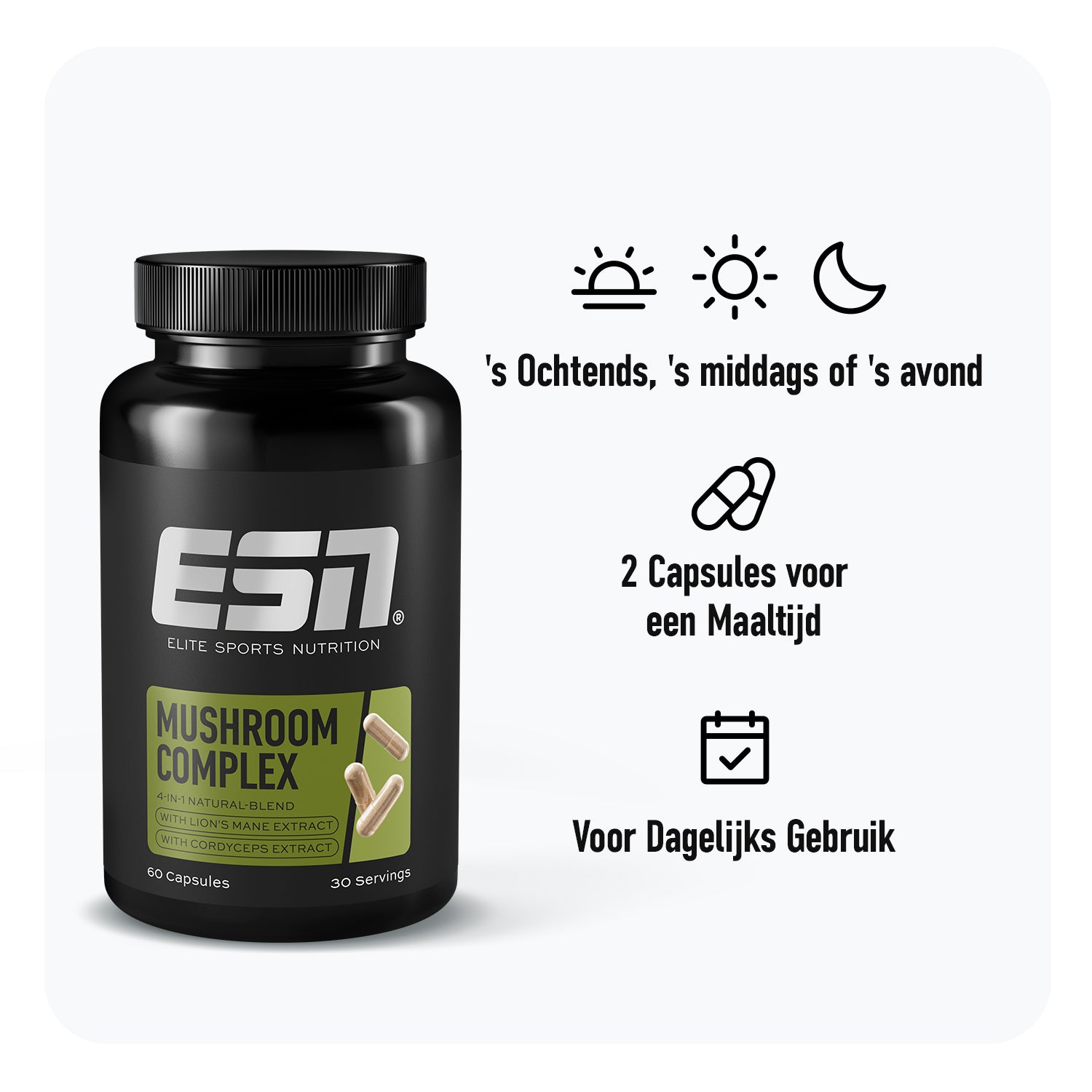 • Hooggedoseerde formule met Lion’s Mane, Cordyceps, Reishi & Chaga